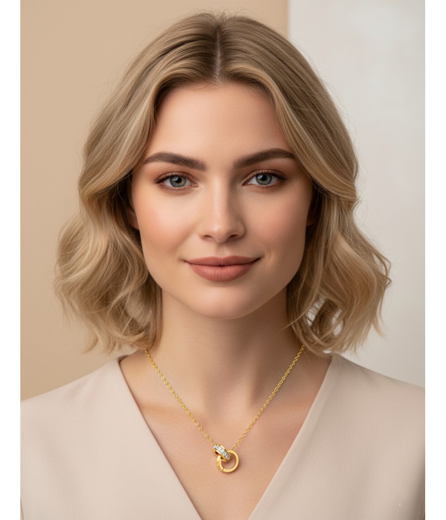 Este delicado collar está adornado con dos anillos unidos entre sí.