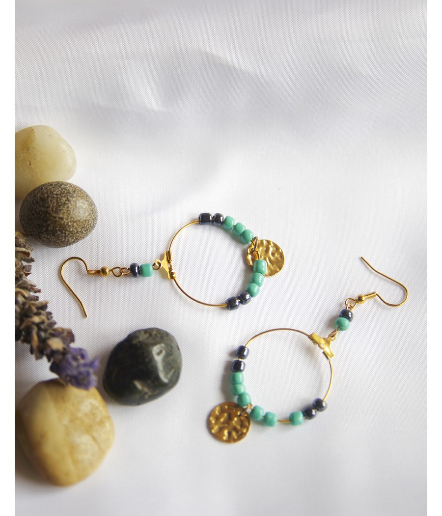 Pendientes de aro colgante adornado con cuentas de semillas en color turquesa y negro.