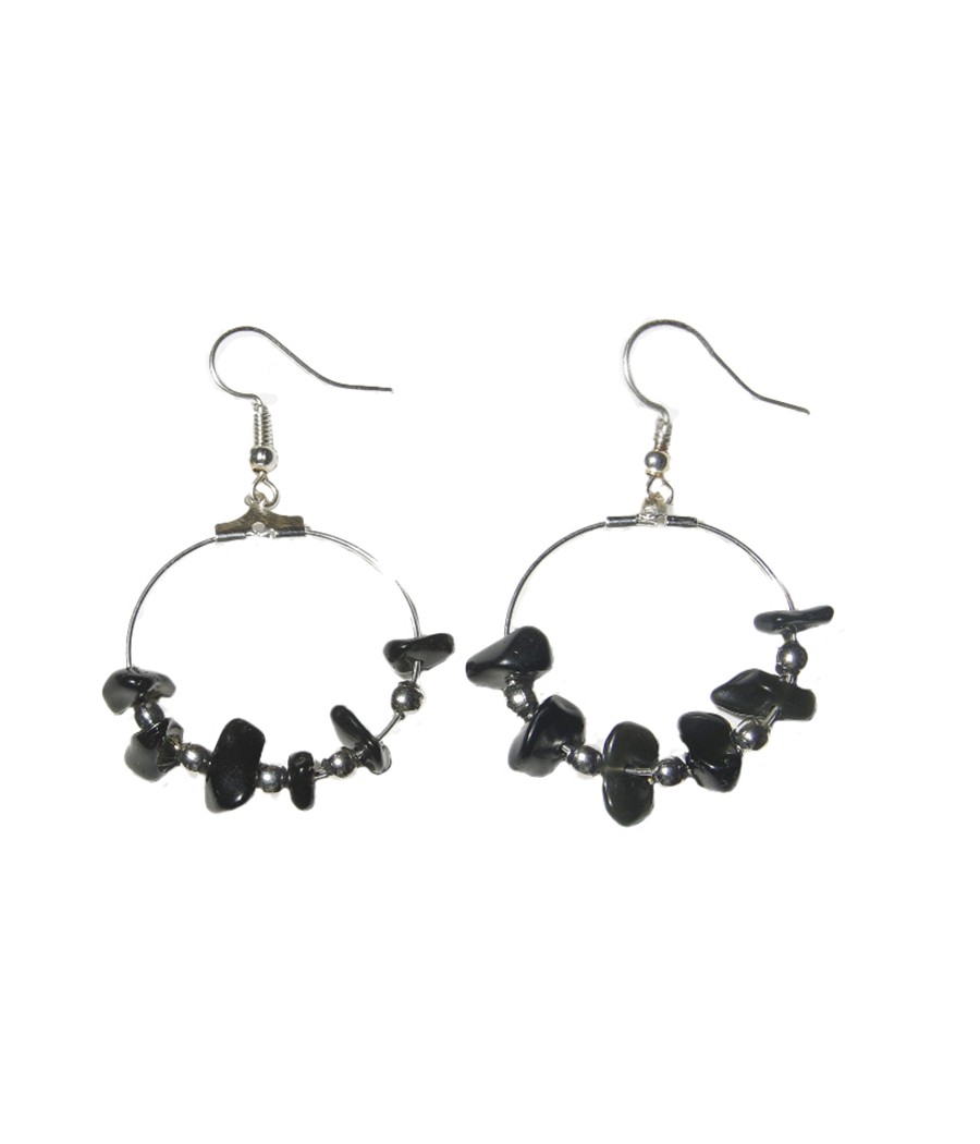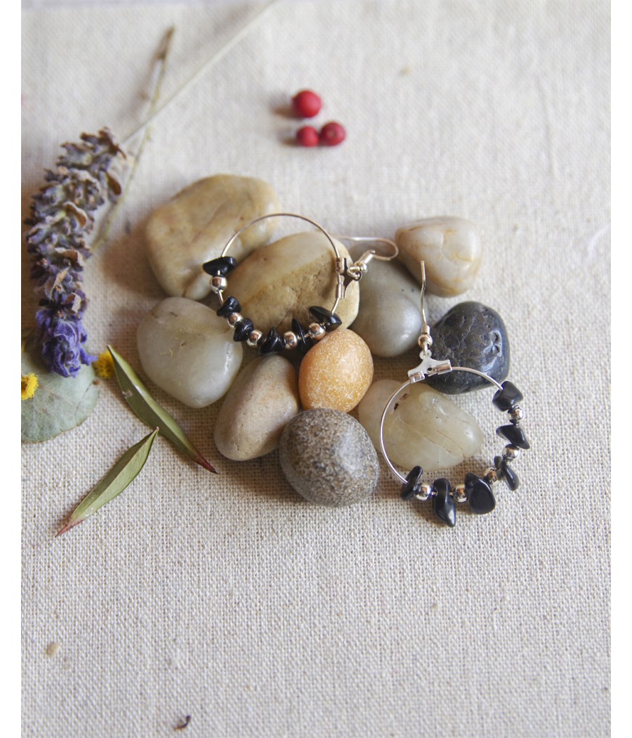 Pendiente de aro colgante, adornado con piedra natural triturada de "Obsidiana".